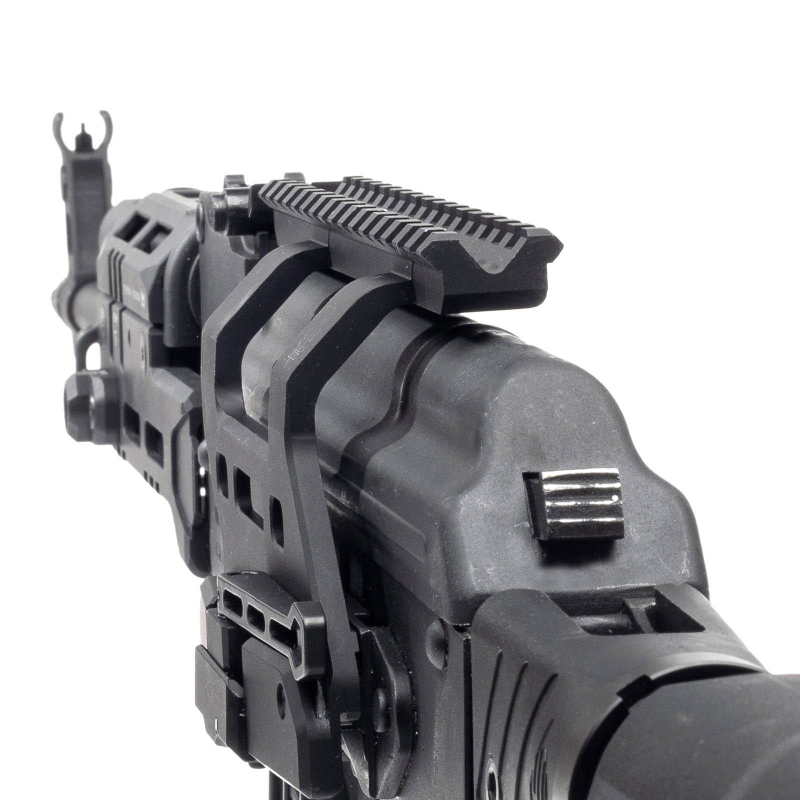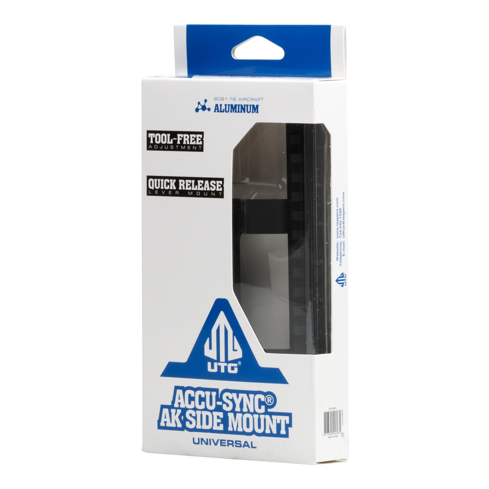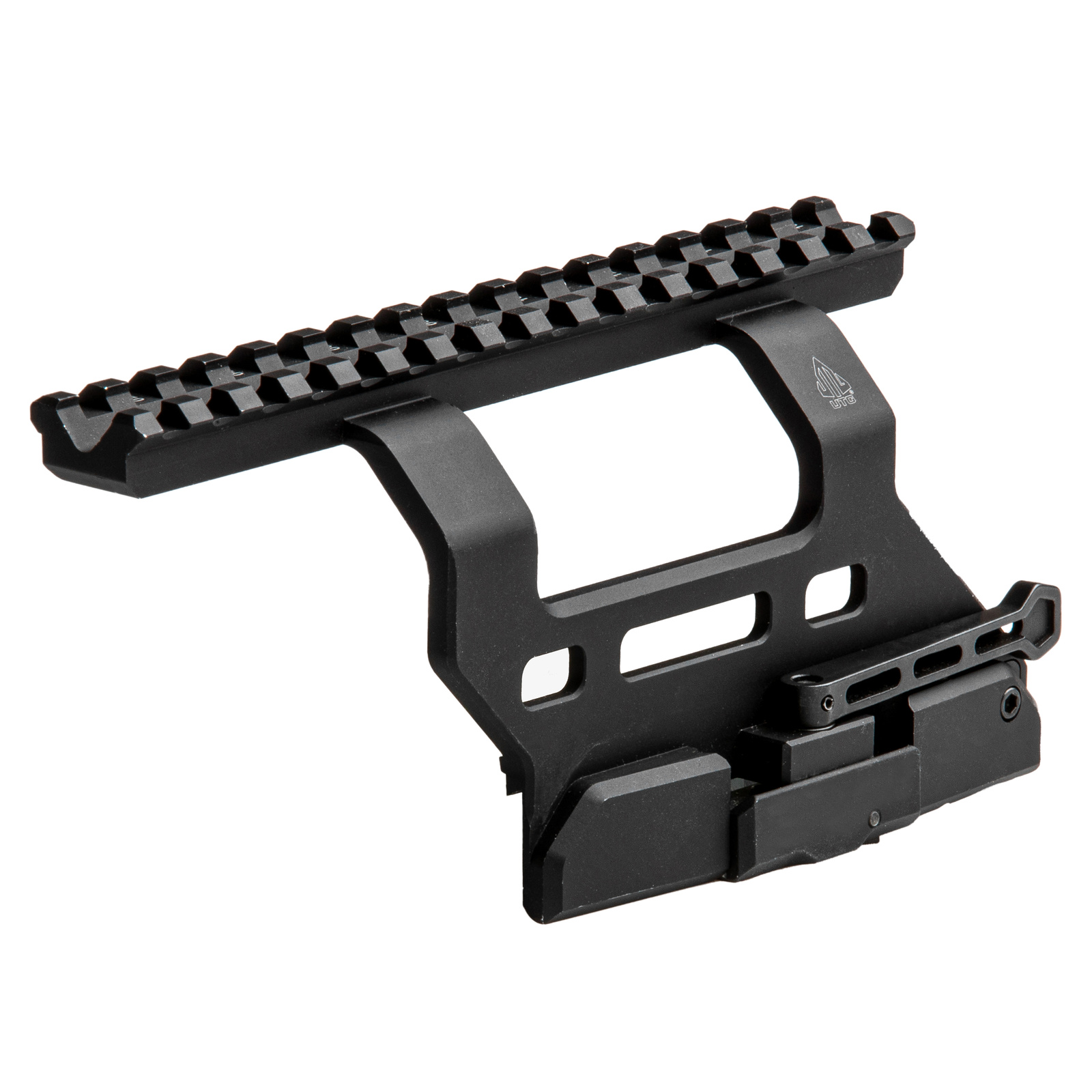 - Boczny montaż UTG ACCU-SYNC MT-UAK01 do AK — szybki system Quick Lock, górna szyna Picatinny 22 mm (16 slotów) i dwa boczne gniazda M-LOK. Lekki, aluminiowy montaż dla dodatkowych akcesoriów i zachowania mechanicznych przyrządów celowniczych.