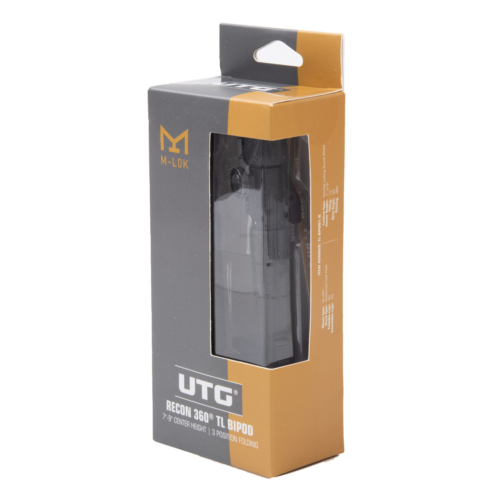 - UTG TLBPM01B dwójnóg Recon 360 TL 7–9" do montażu M-LOK. Składany bipod z regulacją wysokości 168–230 mm, obrotem 360°, przechyłem ±15° i gumowymi stopkami. Lekka konstrukcja ze stali i aluminium, szybki montaż i blokady pozycji.